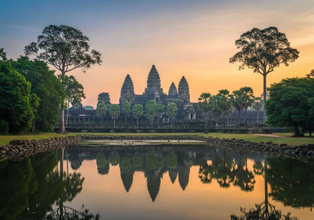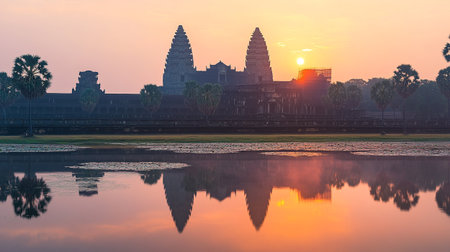 Generative AI : Beautiful view of Angkor temple with sunrise pastel color sky in morning Angkor Wat is a temple complex in Cambodia and the largest religious monument in the world