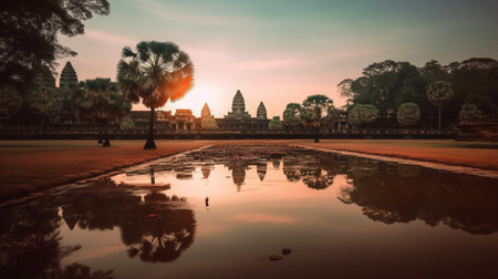 Generative AI : SIEM REAP CAMBODIA December 082019 Beautiful view of Angkor temple with sunrise and lens flare in morning Angkor Wat is a temple in Cambodia and the largest religio