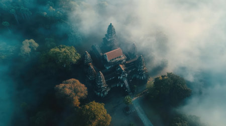 Angkor Wat temple complex surrounded by mist and lush Cambodian jungle