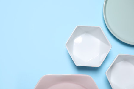 Set of ceramic dishware on light blue background, flat lay. Space for text