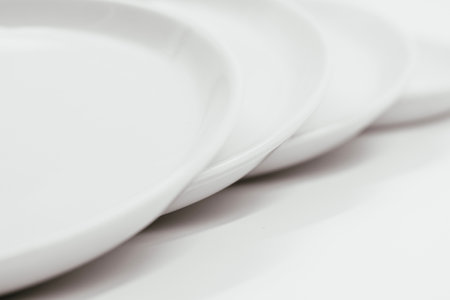 a lot of white clean plates ready to serve. different types of dishes selective focus .