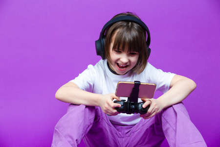 gamepad in blue and purple background. gamepad lying on a black table controller for games. game console