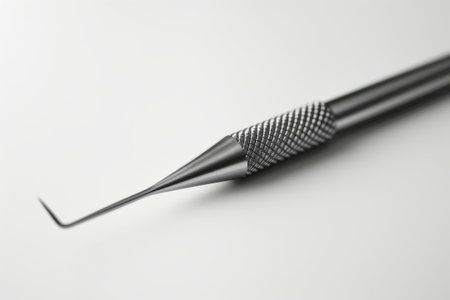High-contrast image of a stainless steel dental tool with pinpoint focus