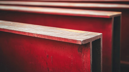 This image showcases a close-up of red steel beams, emphasizing their industrial texture and structural integrity, perfect for designs in construction and architecture.