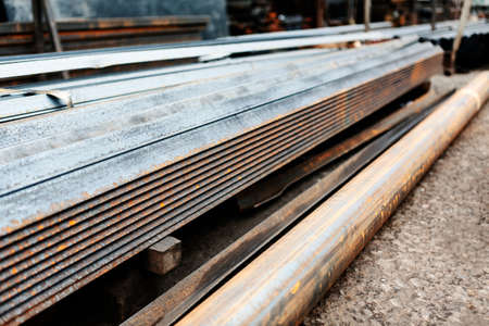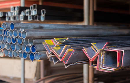 Perspective of pile of construction metals in factory. They consist of square and rectangular steel tubes, iron pipes and bars.