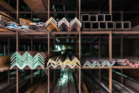 Steel profile on shelves. Metal storage details. Warehouse in shop. metal beams in the room.