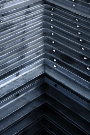 Close-up macro image of a metal shelf showcasing its textured surface. The background features blurred boxes, highlighting an industrial aesthetic with a minimalistic focus.