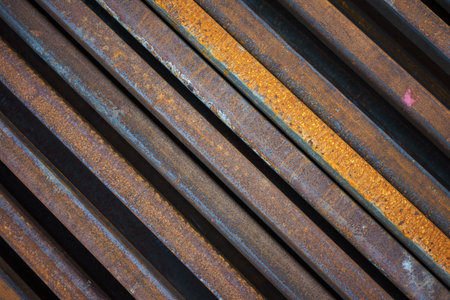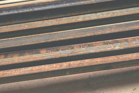 Close-up view of rusty steel rails stacked at a construction site, showcasing textures and details in an industrial setting with machinery behind.