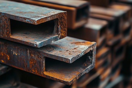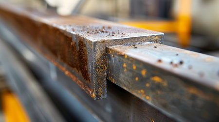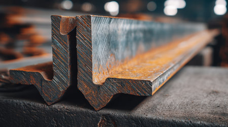 This high-quality image features a close-up view of an industrial steel rail with detailed textures and rust, emphasizing manufacturing and construction themes.