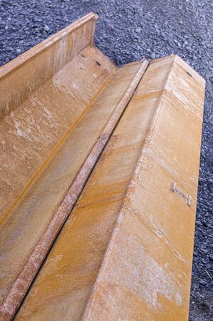 Two sheet pile wall elements lie on a bridge construction site on gravel ground and are joined together, dynamic perspective and selective focus