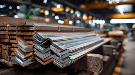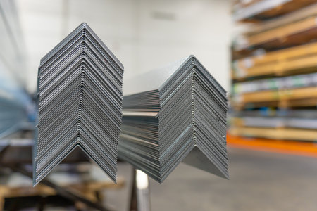A close-up view of stacked steel angles in an industrial warehouse, showcasing the organized arrangement of materials ready for use in construction and manufacturing processes.