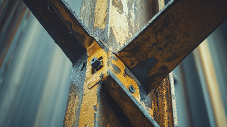 A close-up view of a rusty metal structure showcasing the intricate textures of weathered steel and vibrant yellow paint, highlighting urban industrial aesthetics.