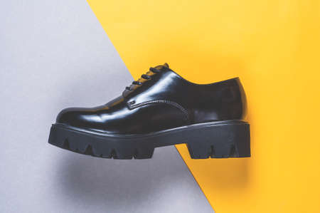 Black classic shoes on a pink background. Pair of new shoes with yellow stitching. Clothing and accessories. Selective focus.