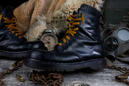 Leather boots with rusted chains and bullet shells with military gas mask and fur coat in background resting on wooden table