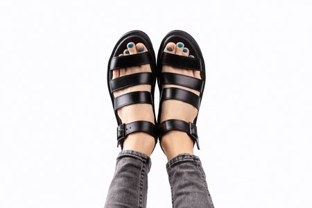 Womans feet with pedicure in black trendy sandals on gray background. Beautiful summer turquoise nail design