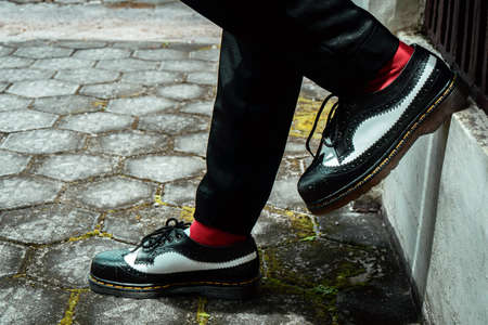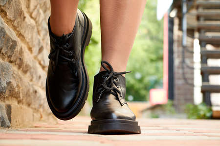 Black female or male leather shoes on legs of woman. Shooting for catalog or an online store outside. A pair of shoes on a girl on the street