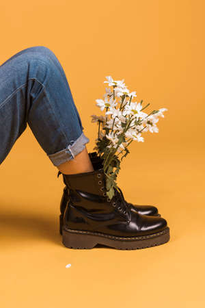 Womans feet in black leather boots with polka dot tights and yellow socks