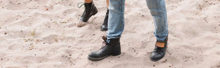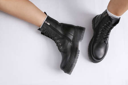 Legs of stylish motorcyclist woman sitting on classic bike. Black retro-styled motorcycle. Lady in brutal trendy leather military boots. Details of vintage design of brand-new motorbike.