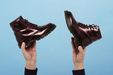 Hands hold boots on a blue background. Concept of shoe selection, shopping, shoe repair.