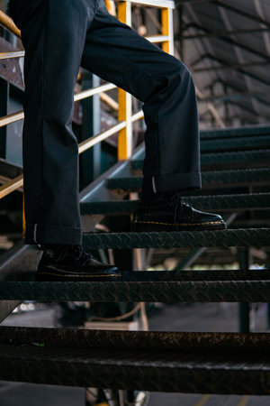 Close-up view of concept photo of full black wingtip brogue shoes made of genuine leather worn by male model in scrap metal warehouse