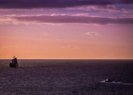 Cargo ship on a calm sea with cloudy skies over the ocean on the coast of Ponta Delgada, Sao Miguel Island, Azores, Portugal