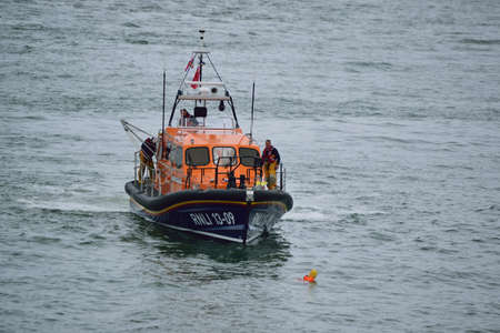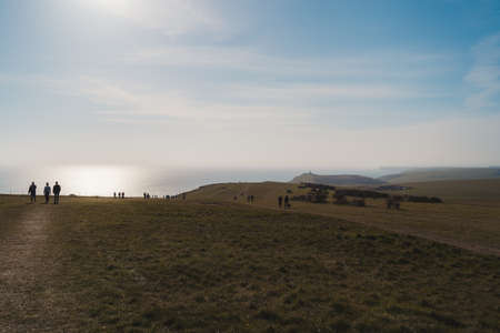 East Sussex | UK - 2021.04.04: People walking the paths of the Seven Sisters, Clifftop Paths Nature Reserve View of the Chalk Cliffs and the English Channel sea from the edge. South of England