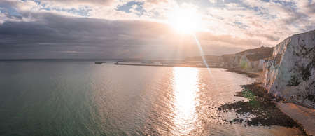 Aerial view of the White Cliffs of Dover. Close up view of the cliffs from the sea side.