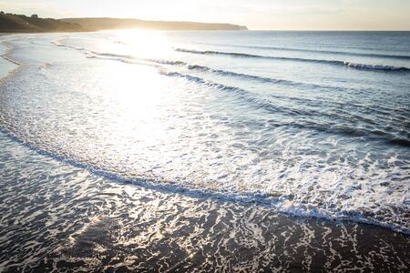 coastal cliffs by the ocean with waves. sunset.