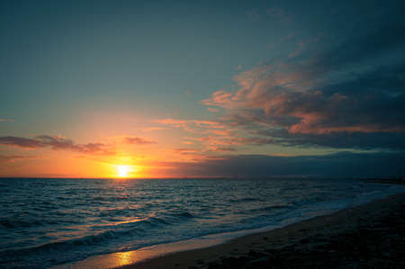Beautiful sunset over sea horizon. Soft colors, mood and magic, subtle light. Small clouds in the sky. Concept of romantic summertime and vacation