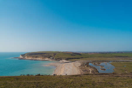 East Sussex | UK - 2021.04.04: Seaford Head Nature Reserve View of the Cuckmere Haven peacefull seafront beach from the top of the Chalk Cliffs walk. Seven Sisters, South of England