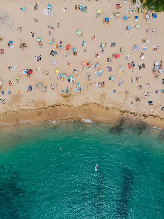 Aerial View From Flying Drone Of People Crowd Relaxing On Beach In Portugal