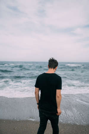 Smiling guy in a black T-shirt stands on the sandy seashore.