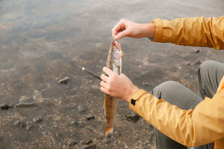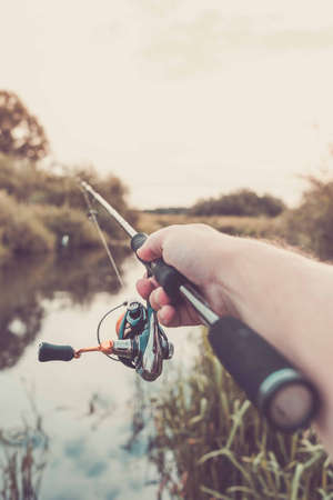Young man fishing on the river. Fisherman holding spinning rod with spoon bait