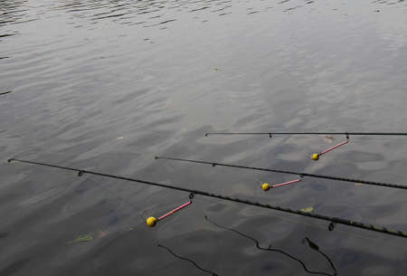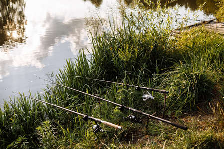 Fishing rod on the background of water. Fishing gear. Fishing on the lake. Rest on the lake