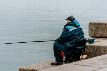Fisherman is patiently waiting for a bite while fishing in the cold alaskan waters