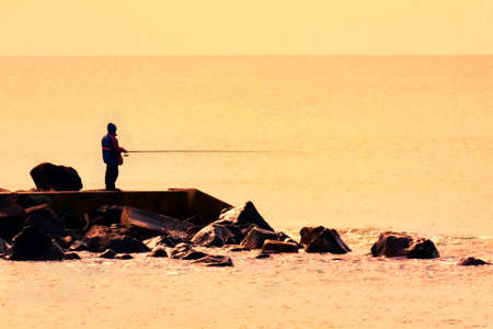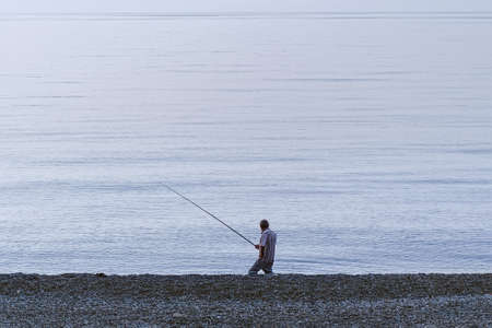 Fisherman on the shore of a calm sea. Evening fishing. Minimalistic seascape. Motion blur effect.