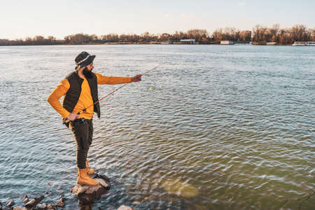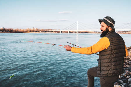 Man fisherman with fishing rod fishing in river fishing lake waterscape
