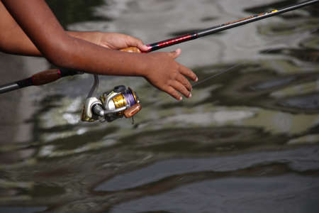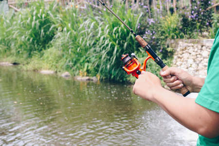 Hand is catching fishing rod and water background.