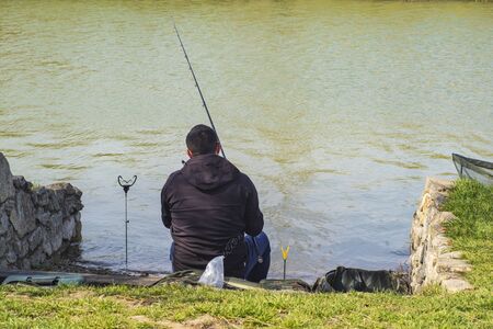 Fishermen fishing with a spinning rod from the shore on a sunny day. Fishing on a sunny day. Man on the river bank throws a spinning rod.