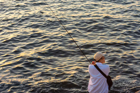 Osaka / Japan - September 30, 2017: Japanese man with a fishing rod fishing at seashore in Osaka Bay, Japan