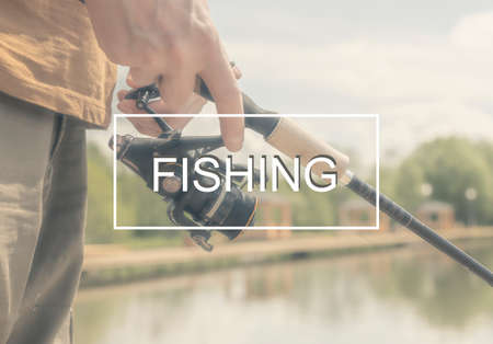 Fishing word in frame on photo with fisherman hands closeup with reel rod in hands on summer day.