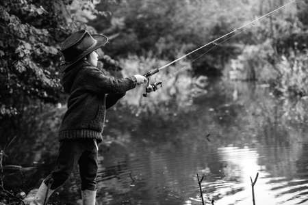Little boy child catching a fish. Kid with fishing rod at lake. Lonely happy little boy fishing from beach lake.