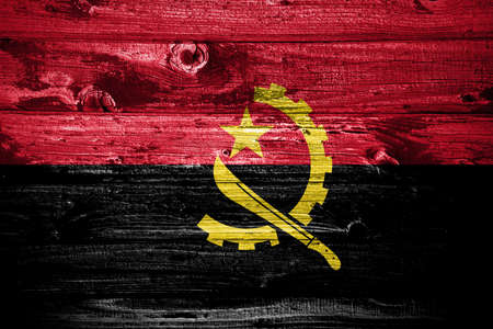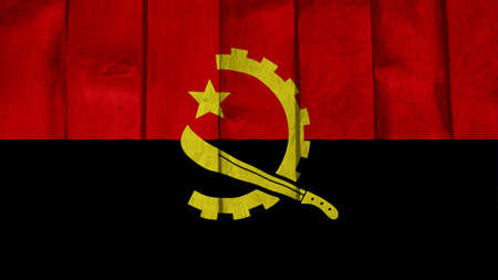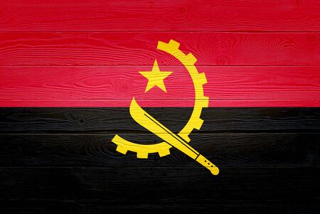 Angola flag painted on old wood plank background. Brushed natural light knotted wooden board texture. Wooden texture background flag of Angola.