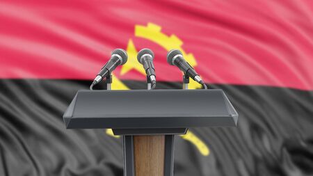 Podium lectern with microphones and Angolan flag in background