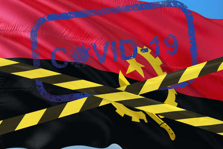 Barrier tape - quarantine, isolation, coronavirus entry ban. Angola flag waving in the wind stamp covid 19