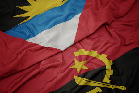 waving colorful flag of angola and national flag of antigua and barbuda. macro