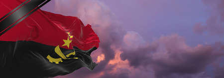 national flag of Angola with Mourning Ribbon. memory of victims of war, terrorist attack, coronavirus. Black funeral ribbon on flag Honoring memory of victims. 3D illustration.
