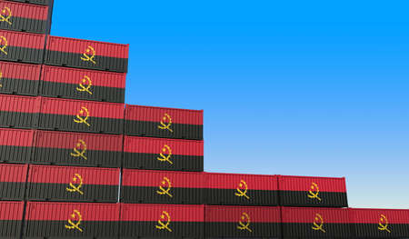 Containers with flag of Angola represent declining trend. Economic or export crisis concept. 3D rendering