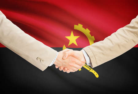 Businessmen shaking hands with Angola flag on background