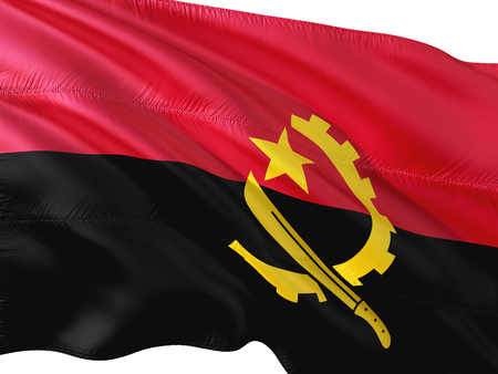 Flag of Angola waving in the wind, isolated white background.
